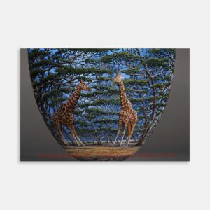 How could you not be inspired by the harsh beauty of an African dry season with the cryptic contrast of the Reticulated Giraffe. Pictured here in amongst acacia trees looking for water. The water hole at the base of the vessel has dried up so the giraffe will have to search further afield for water.
