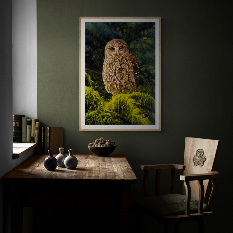 Whisper is Wingspan’s (https://www.wingspan.co.nz/) adult female ruru ambassador, New Zealand Morepork owl, Ninox novaeseelandiae. Depicted in a New Zealand cloud forest late in the afternoon catching the last warmth of the sun before the night time of whispering flight while hunting.